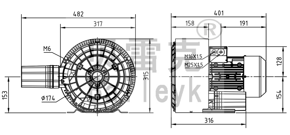 最大風量:150m3/h 最大正壓:280mbar 最大負壓:280mbar 防護等級:IP55 噪音:66db 重量:25Kg |